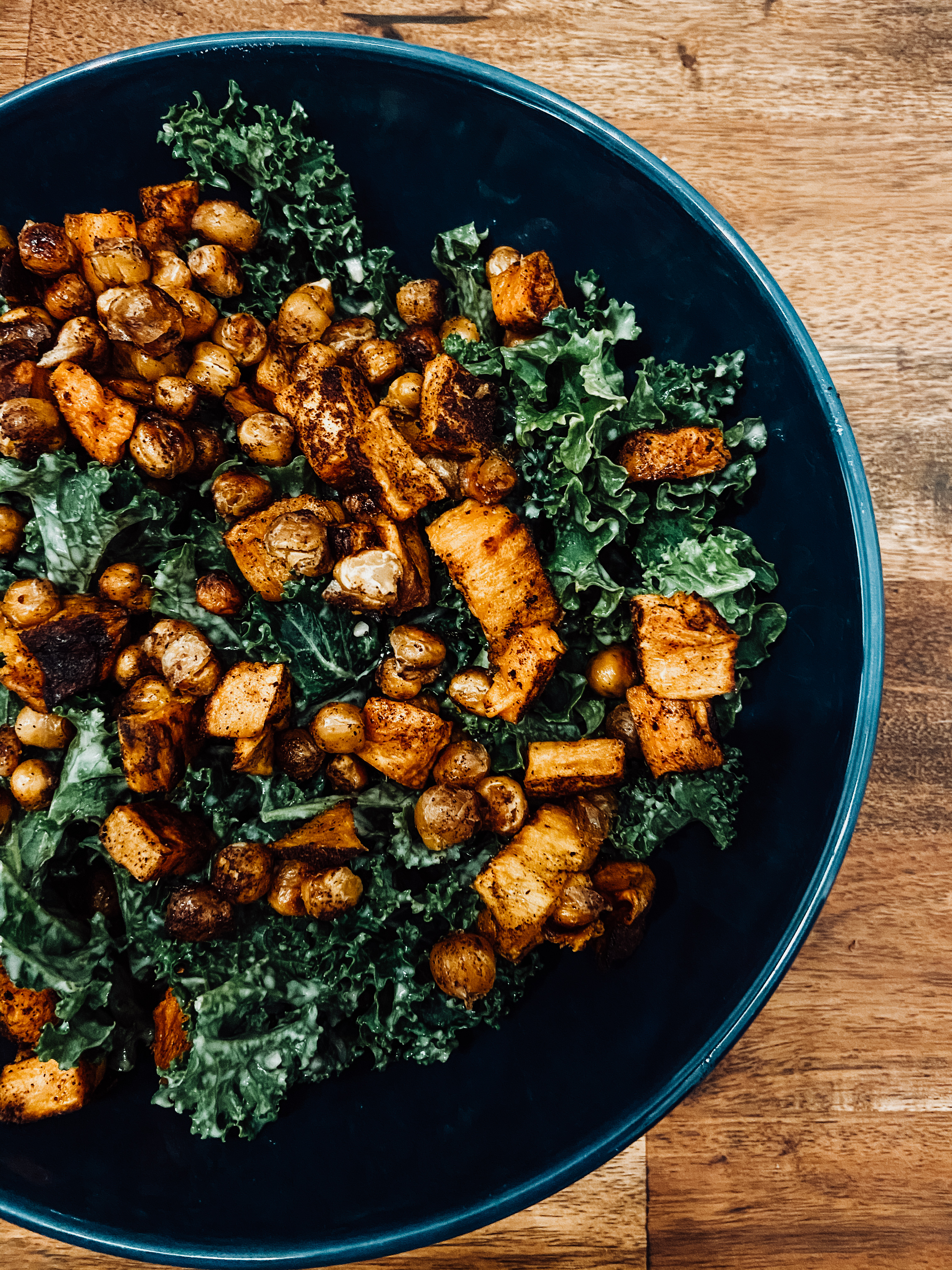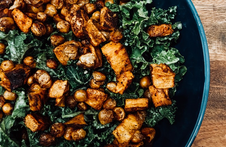 Portion the kale into bowls, top with the warm roasted sweet potatoes and chickpeas, and garnish with the roasted pumpkin seeds