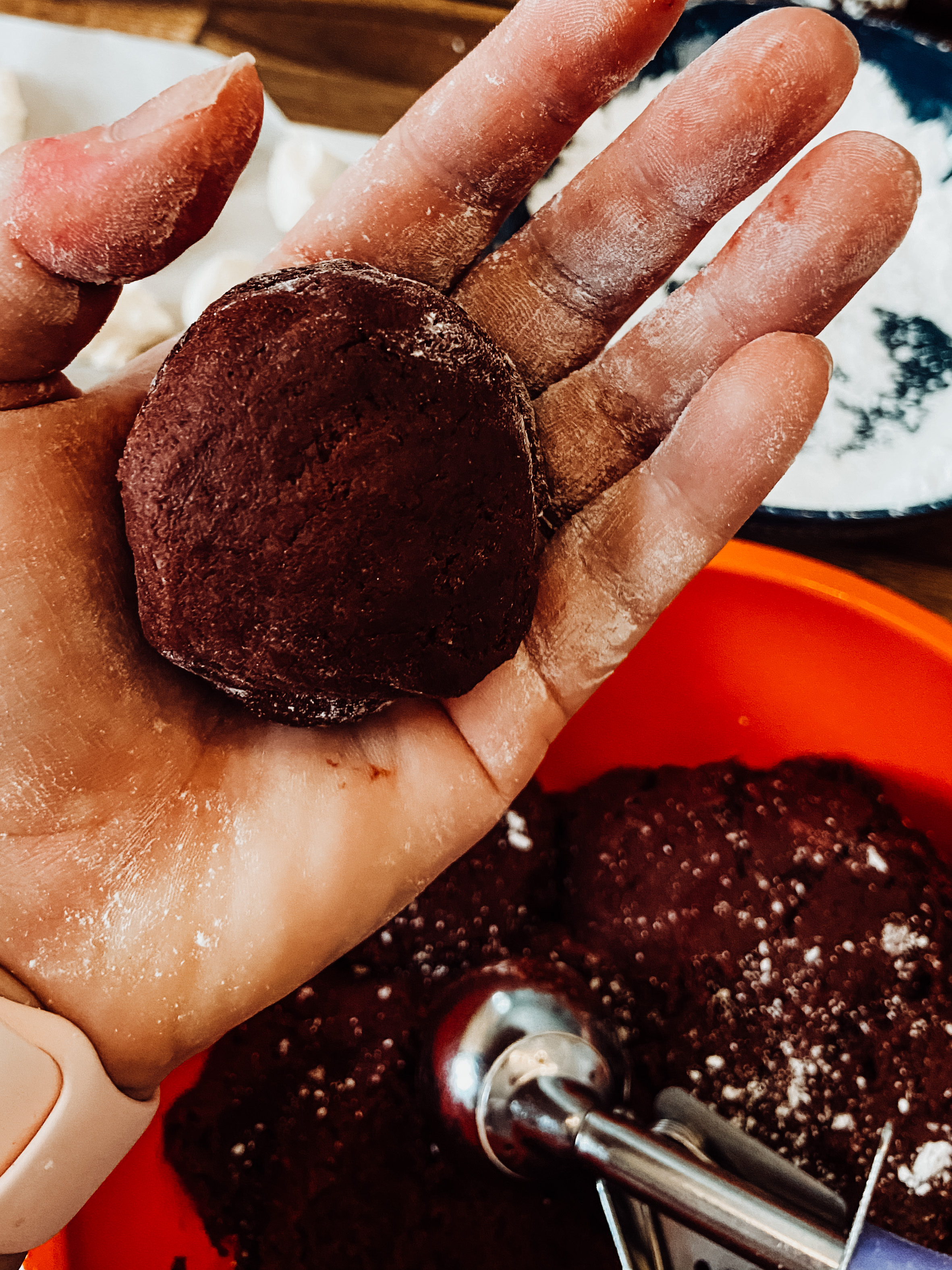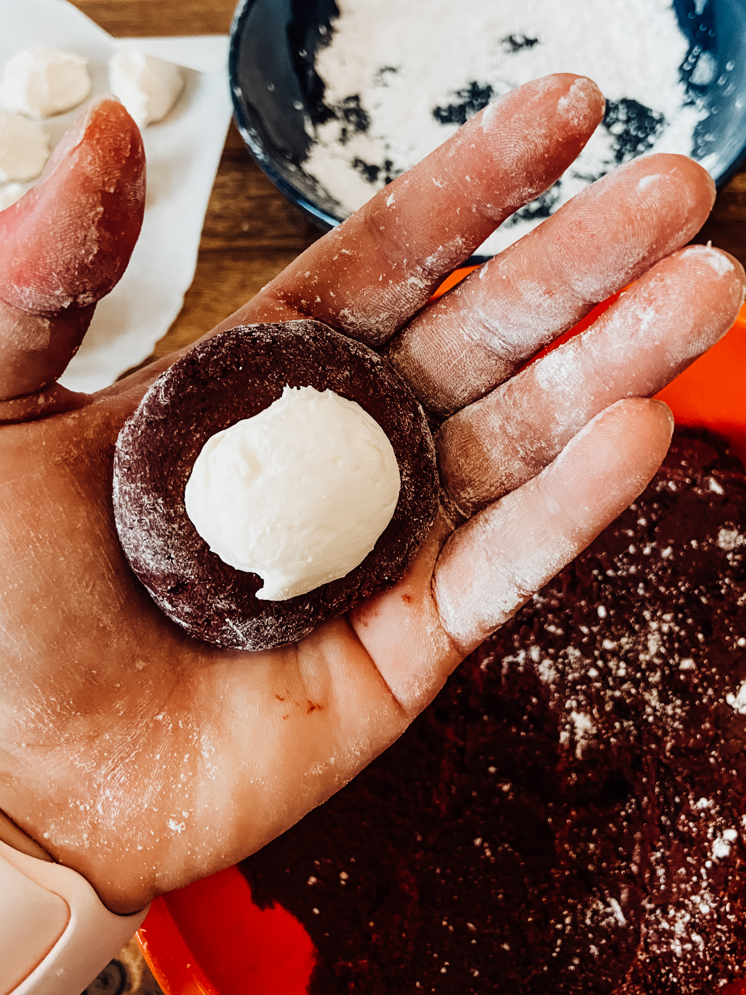 This is a cookie that takes time, you need to make ahead the cheesecake centers so they can freeze, as well as the dough needs to time to chill in the fridge – so either take a couple days to make, or throw on a few tunes, and move around in between (like I said my scale gets a workout this time of year)